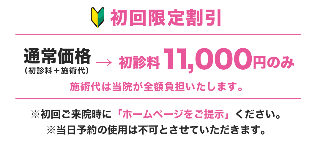 | 初診料・再診料 | 初診料:11,000円 再診料:1,100円~11,000円 ※初診(初めて受診する方)、再診(最終来院日より1ヶ月以上経過している方。) |