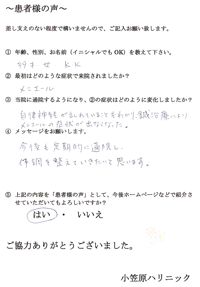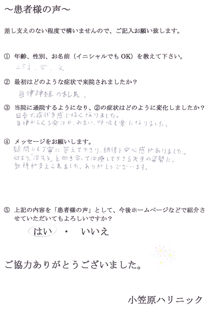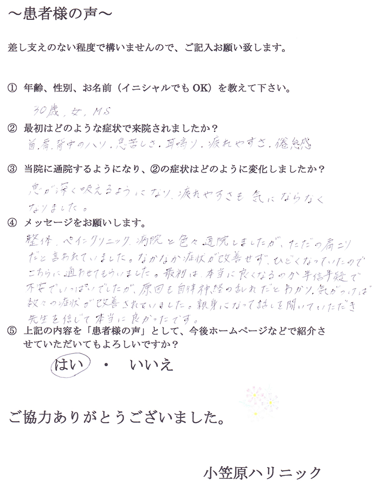 体調が良くなってくると、自身もできて、いろんな事に前向きになってきました。先生には施術の他にも生活においてのアドバイスをいただいたり、やさしく話を聞いてくださったり親身になって治療してくださり。本当にありがとうございました。小笠原ハリニックを紹介してくれた友人にも感謝です!心と体はつながっているんですね。