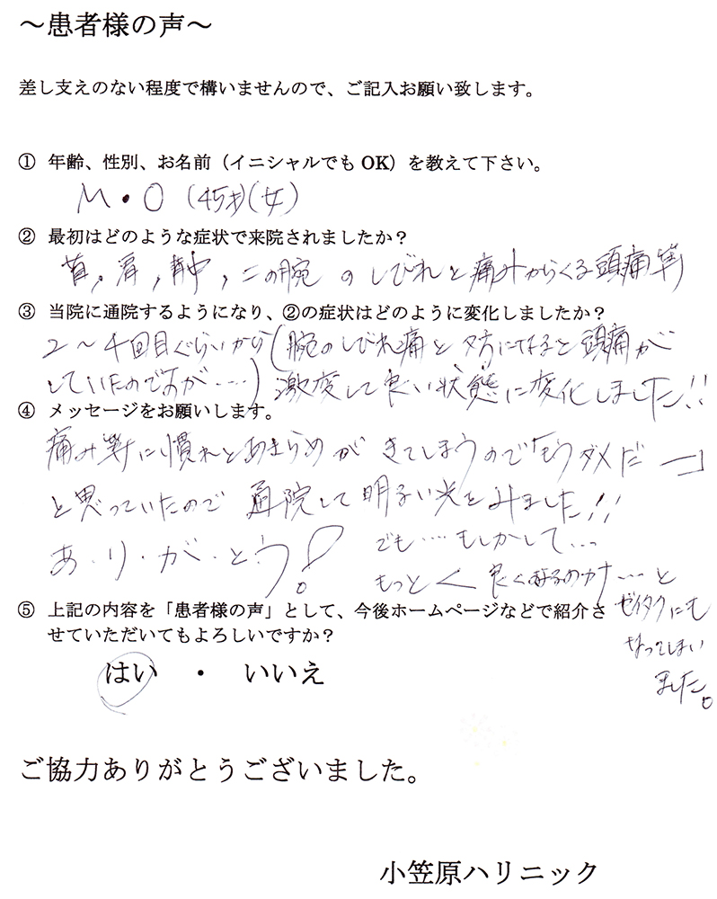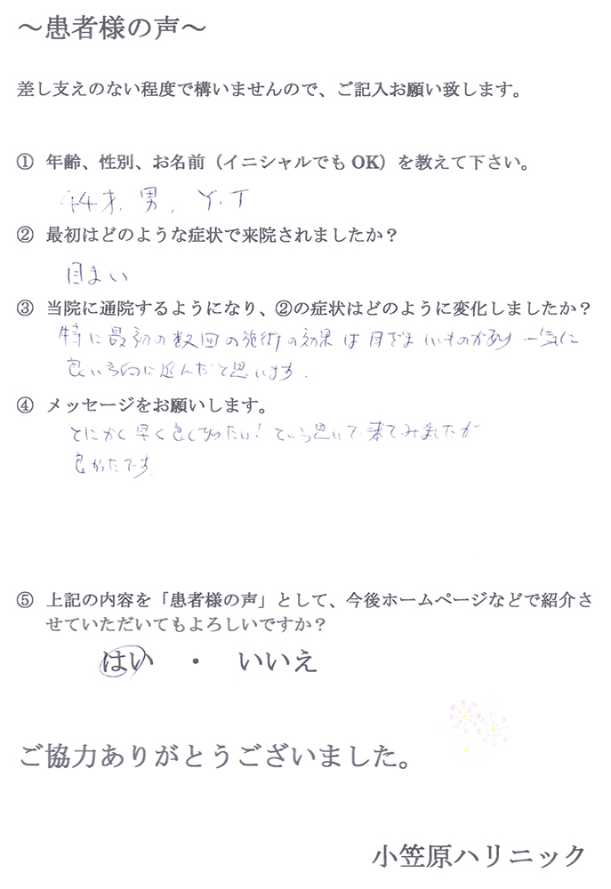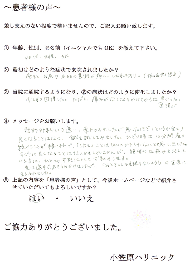 小笠原先生には施術の他に日常生活での心がけることなどご指導いただきました。辛い痛みから解放していただき、快適な日々を過ごしております。先生には大変感謝しております。ありがとうございました。