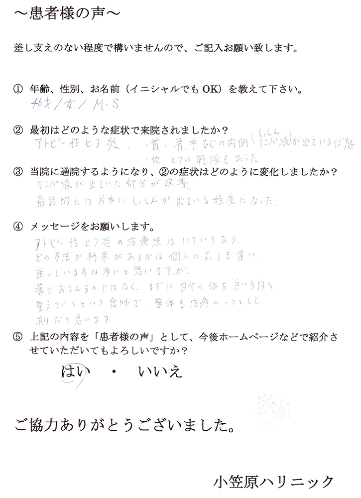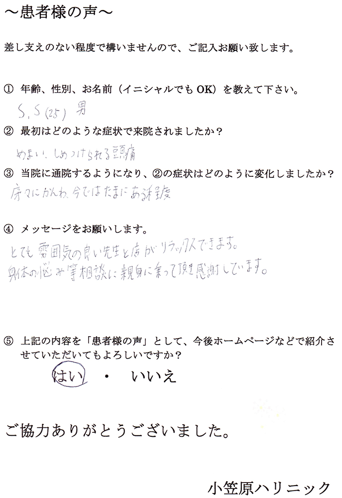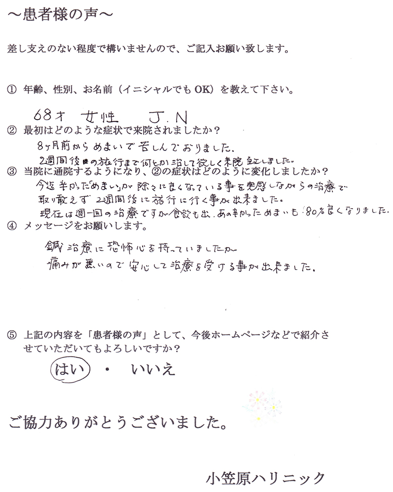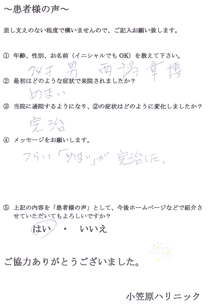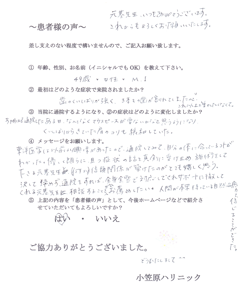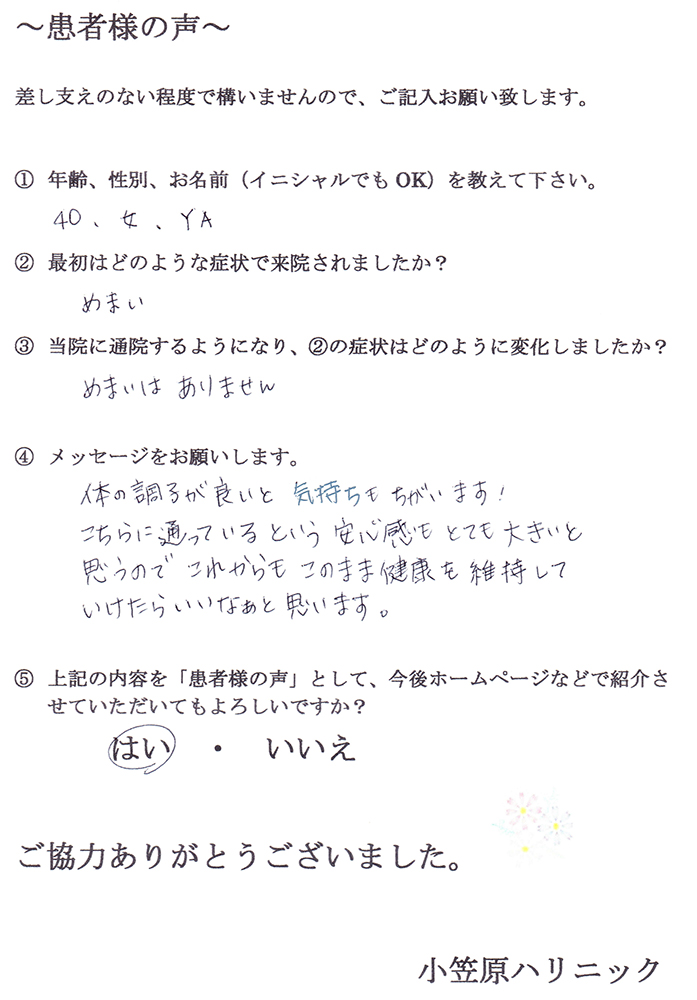先生にお会いし、それがうそのように改善されました。小笠原先生には本当に感謝しています。